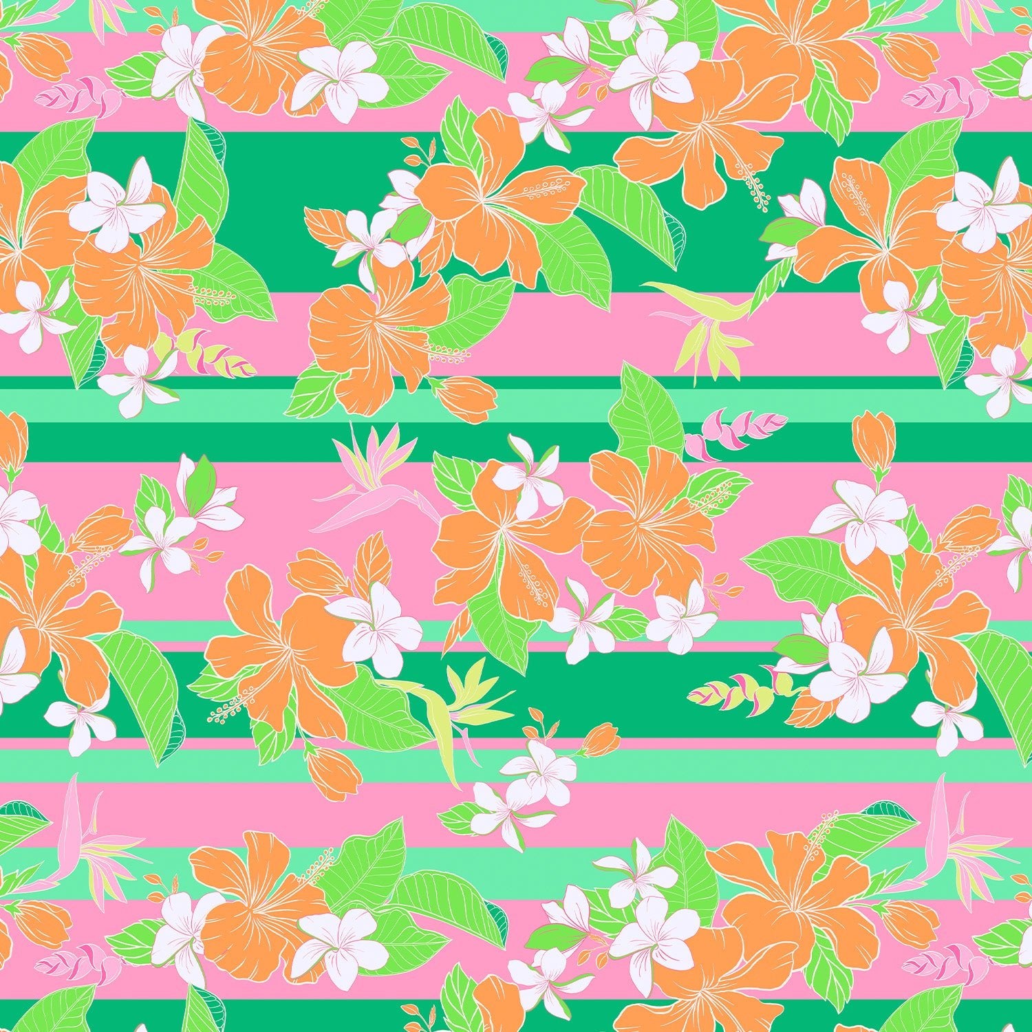 St. Lucia blends stripes and florals into one island-ready look. With green and pink horizontal stripes overlaid by orange and white blossoms, it’s the perfect mix of classic and carefree. Tropical with a twist, this print feels like vacation in full color.