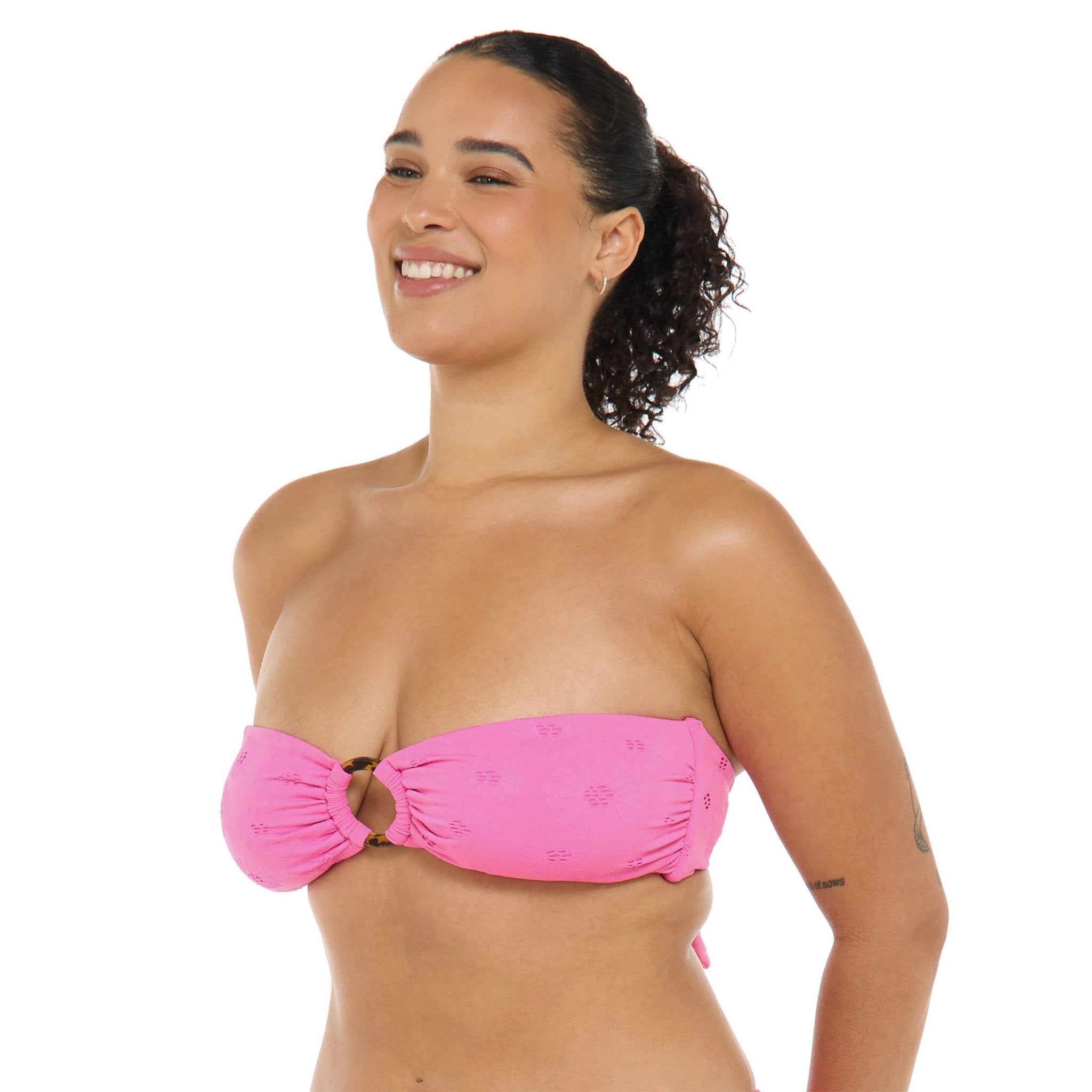 Préparez-vous pour l'été avec le haut Aria! Il présente un mignon anneau décoratif et des bonnets souples à coussinet amovible pour votre confort. De plus, il se noue au dos pour vous assurer d'avoir l'ajustement parfait. Le haut parfait pour afficher votre style à la plage ou à la piscine.
